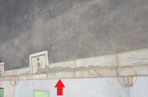 道路と土地の間に赤い矢印が指すL型側溝は、長さが決まっていて、