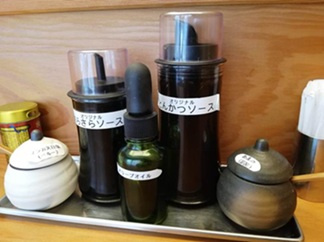 卓上には2種類の塩、ソースのほか、オリーブオイルも用意されており様々な味の変化を楽しめます。
